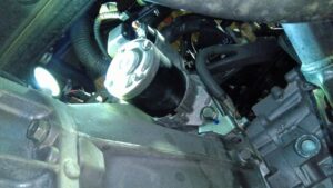 スターターモーターを外して、ミッションを降ろします。