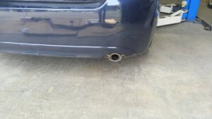 タイヤ止めにリアマフラーを引っかけてしまい、マフラーが曲ってしまったとの事。